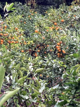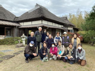 | 津久井浜駅前からのバス送迎で観光みかん園へ、14名参加、袋一杯500円。 | 帰り道、津久井浜駅近くの万代会館見学後、庭園で昼食。 |